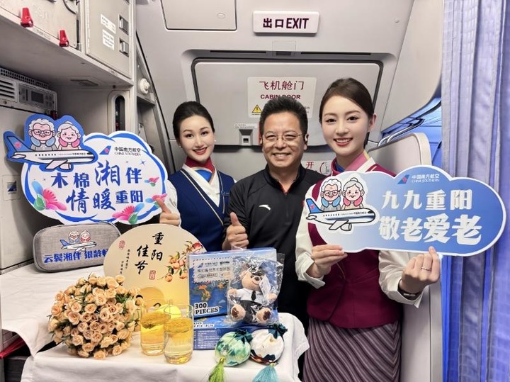 新华网长沙10月28日电(杜欣 明星 龙洁琼)金秋重阳,情暖云端。近日,南航湖南分公司在CZ6177长沙—长春航班上推出“木棉湘伴·情暖重阳”主题航班,以特色活动与温情服务,陪伴旅客在万米高空共度传统佳节。