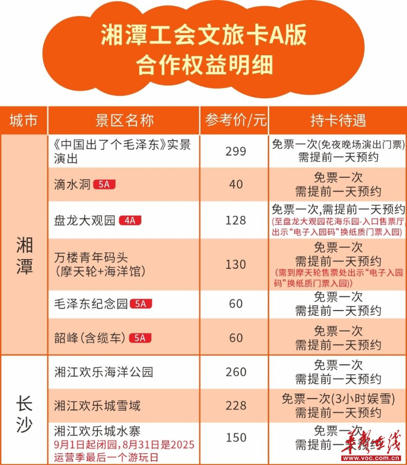 与往期不同的是,本期活动将集中发放“定向文旅券”。中签会员可获得“湘潭工会文旅票”(分A、B版,二选一),针对湘潭工会文旅票对应的景点凭票都可免费入园一次。 活动秉承公平公正原则,采用“在线报名+摇号中签”方式。只要是录入湖南省网上工会工作平台的工会会员(含新就业形态劳动者),均可参与。