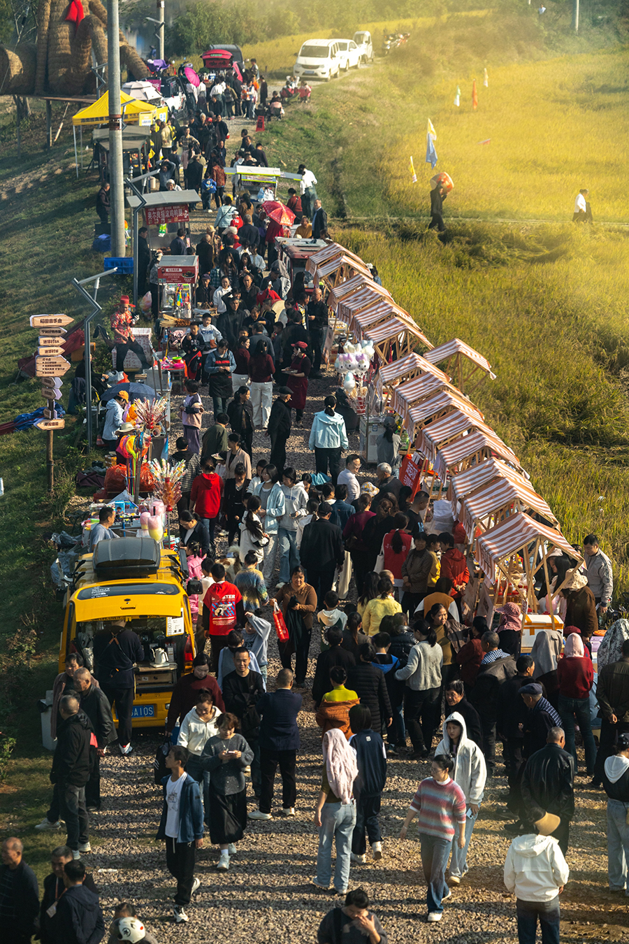 沿田埂蜿蜒而行,下田摸鱼、稻穗插花、游船赏景、非遗展演等丰富多彩的田园体验与文化活动第次展开,游客们挽袖卷衣,乐在其中。“宁飨好物”小镇集市全天开放, 40个摊位整齐排列,金洲大米、宁乡四小碟、手工红薯粉等特色农产品现买现尝,新鲜采摘的蔬菜、刚出炉的农家糕点散发着自然香气;非遗糖画、“宁造物”手作、竹编工艺品等文创产品琳琅满目,尽显乡土匠心。