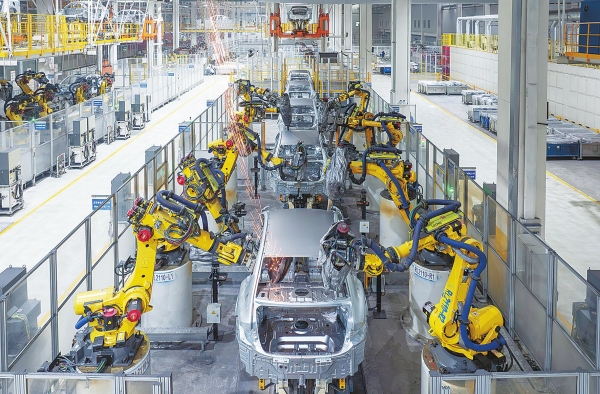 3月13日,长沙比亚迪雨花基地焊装工厂,智能化生产线上的机械臂有条不紊地工作。