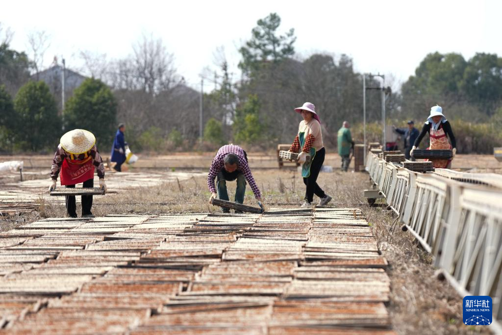 3月12日,在岳阳市岳阳县筻口镇丰瑞农机专业合作社,农民在搬运早稻秧盘。新华社记者 陈振海 摄pagebreak