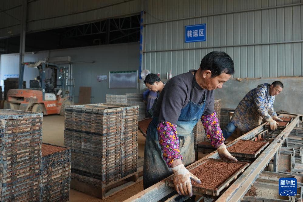 3月12日,在岳阳市汨罗县罗江镇,农民在育秧大棚内摆放早稻秧盘。新华社记者 陈振海 摄