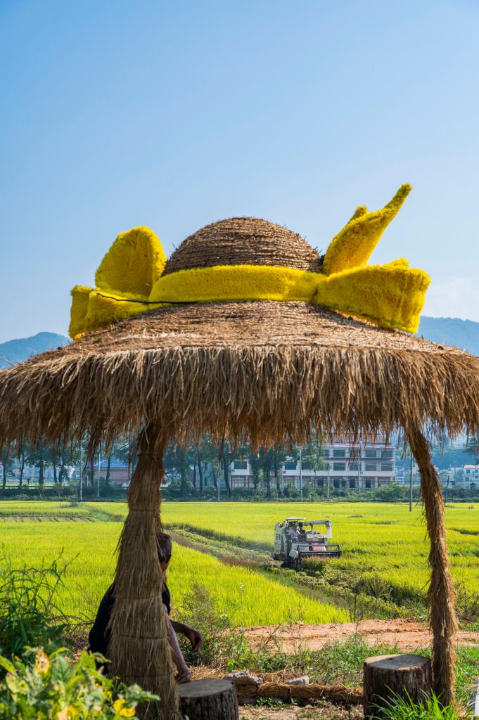 10月11日,湖南省衡阳市衡山县白果镇村民驾驶农机收割稻谷(无人机照片)。新华社发(曹正平摄)pagebreak