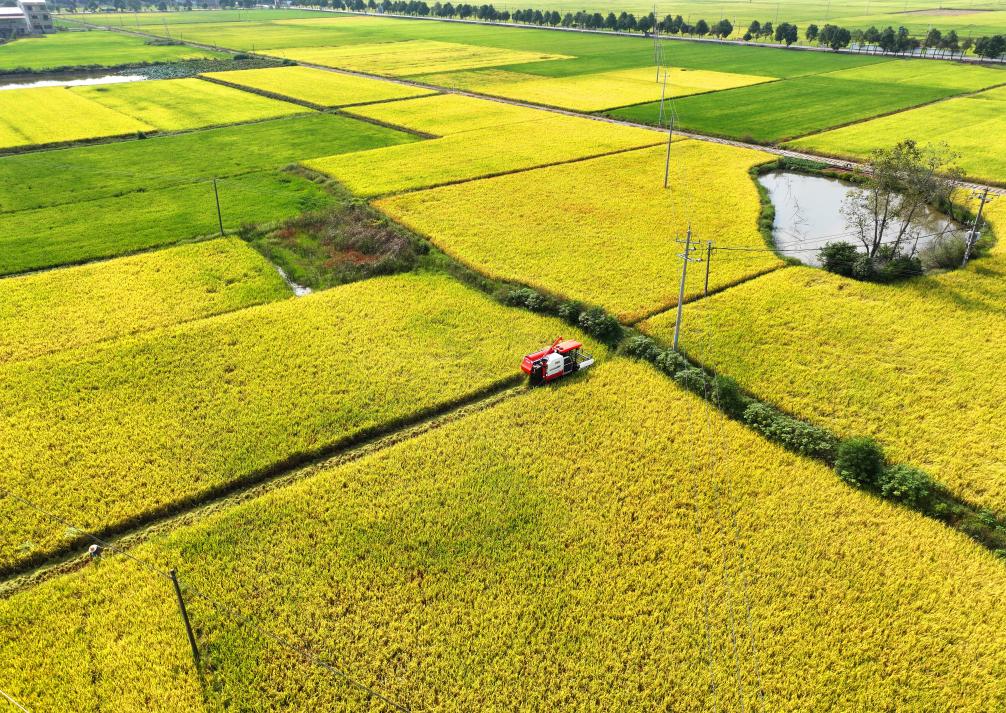 10月11日,湖南省常宁市洋泉镇农民驾驶收割机在收获水稻(无人机照片)。新华社发(周秀鱼春摄)pagebreak