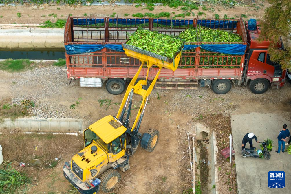 10月14日,在南县华阁镇新安村,村民操作铲车把刚采摘的水果玉米运输上车(无人机照片)。新华社记者 陈思汗 摄pagebreak