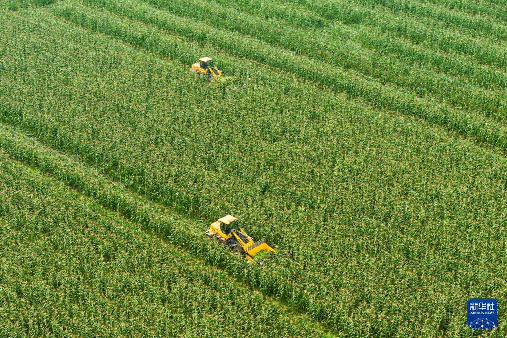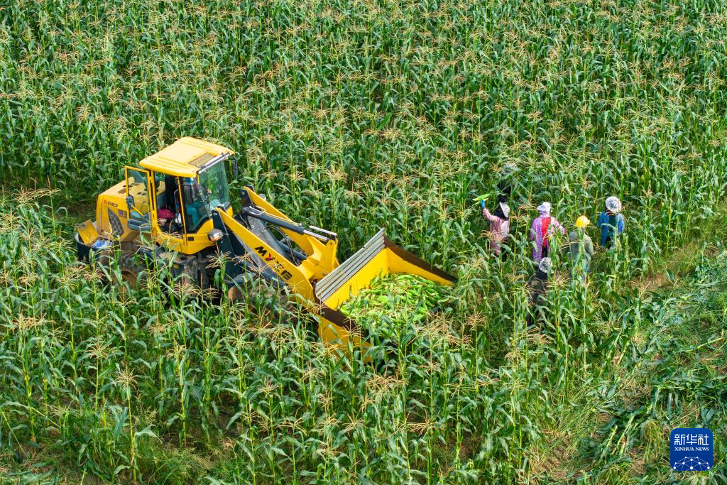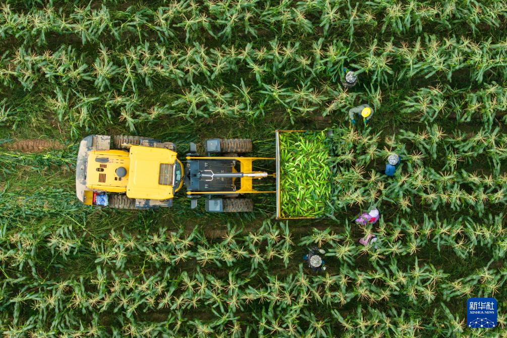 10月14日,在南县华阁镇新安村,村民在采摘水果玉米(无人机照片)。新华社记者 陈思汗 摄
