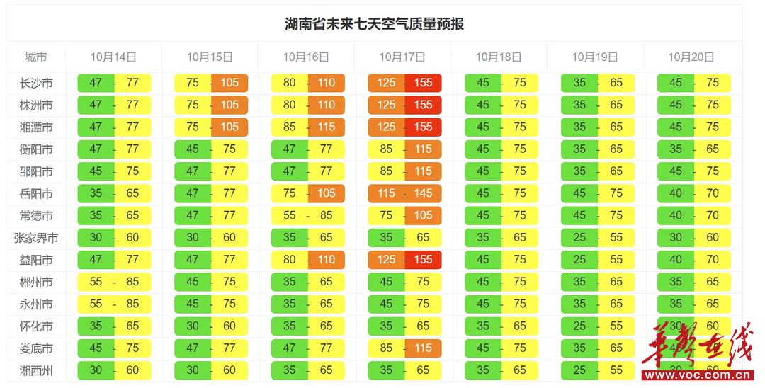华声在线10月14日讯(全媒体记者 赵瞳铱 实习生 李彦冰)记者今天从省生态环境监测中心获悉,15日至17日,受秸秆焚烧影响,湘中、湘北地区部分时段空气质量存在中度污染风险,其余地区空气质量以优至良为主。