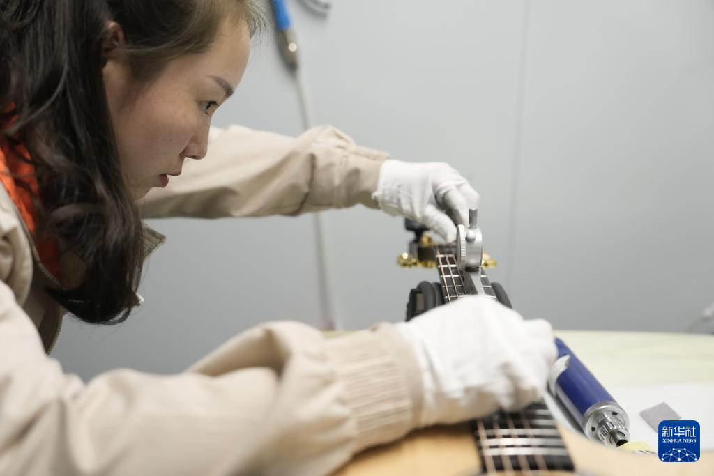 1月7日,研发人员在位于湖南宁乡的湖南省卡玛乐器制造有限公司研发试验室调试吉他。新华社记者 薛宇舸 摄pagebreak