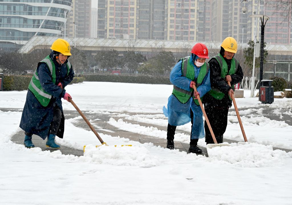 1月19日,在安徽省亳州高新区市政公园,园林工人在清理路面积雪。新华社发(刘勤利摄)