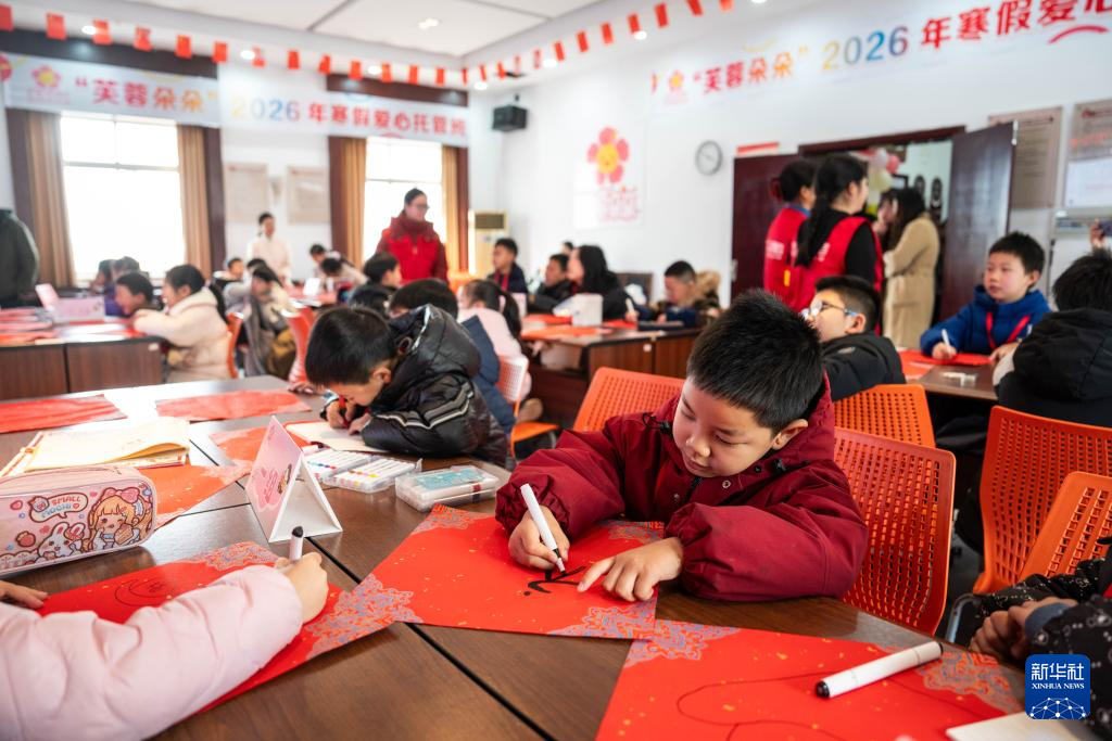 2月1日,在芙蓉区识字里社区服务中心,学生们在课堂上写福字。新华社记者 陈思汗 摄pagebreak