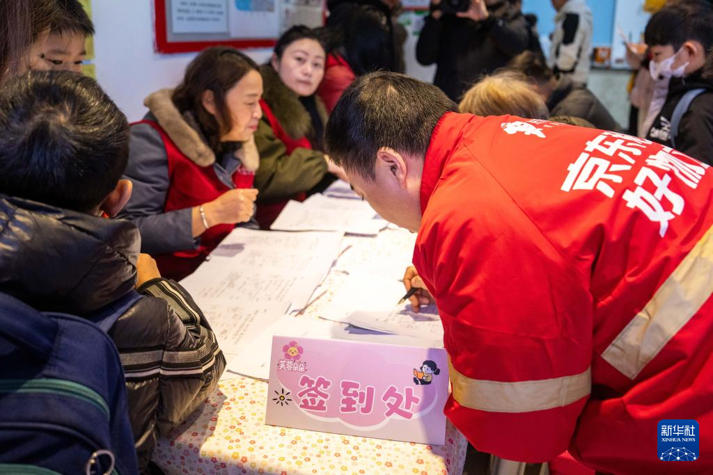 2月1日,在芙蓉区识字里社区服务中心,家长(右一)为学生办理入托手续。新华社记者 陈思汗 摄