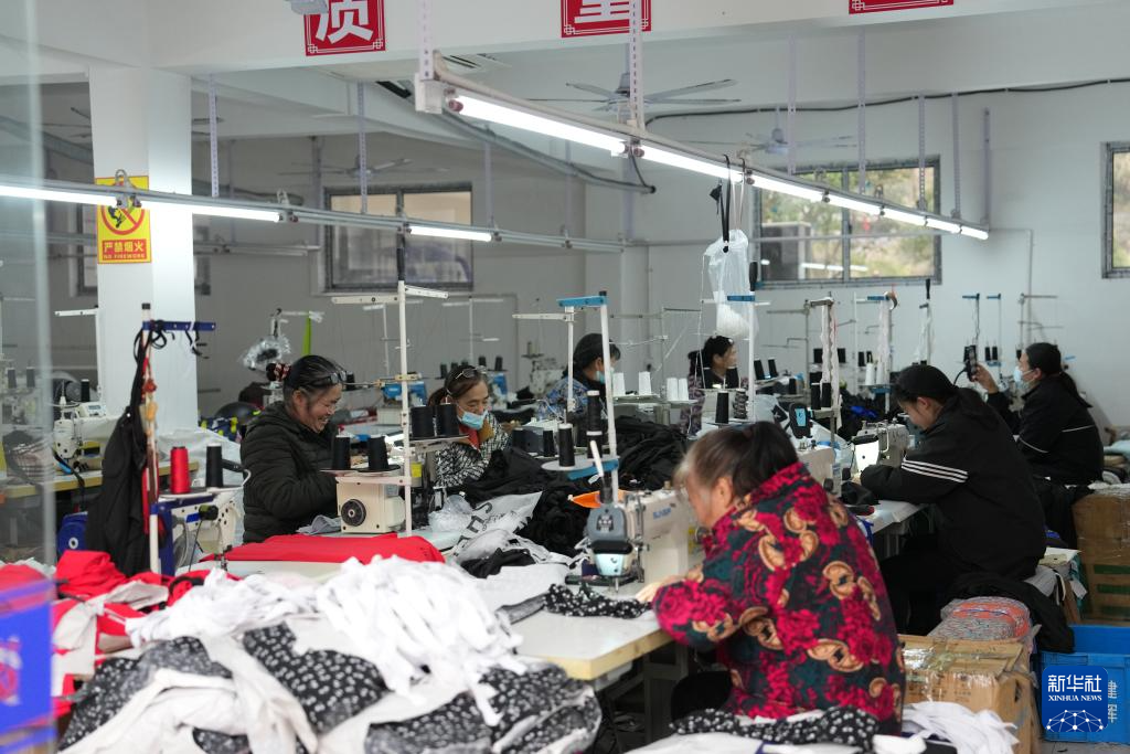 2月5日,当地群众在资兴市州门司镇集中安置点福祥苑小区旁的服装厂工作。新华社记者 陈振海 摄pagebreak