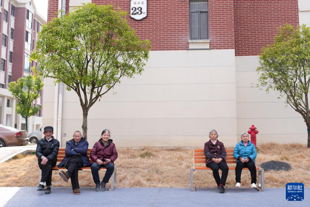 2月4日,在资兴市兴宁镇集中安置点福兴苑小区,几位老人休息闲谈。新华社记者 陈振海 摄