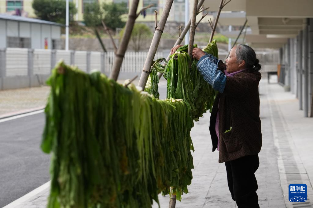 2月5日,在资兴市州门司镇集中安置点福祥苑小区,一位老人晾晒用来腌制的蔬菜。新华社记者 陈振海 摄pagebreak