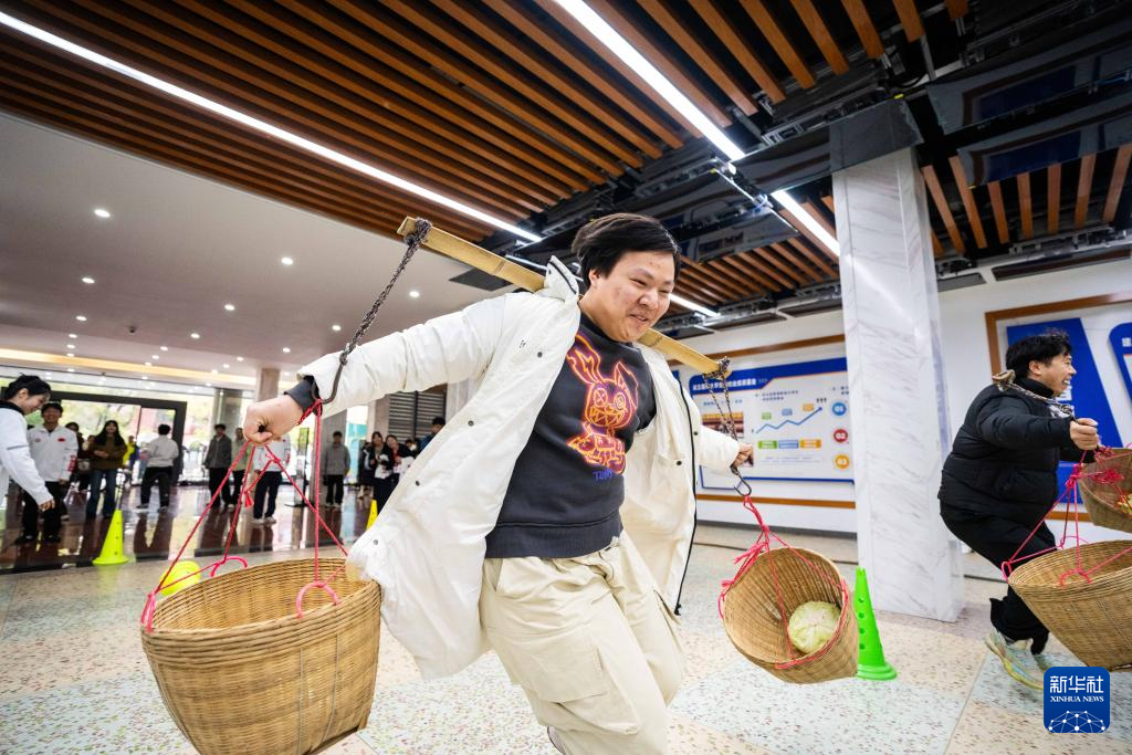 3月19日,学生在湖南农业大学参加农趣运动游戏——竞速搬运。新华社记者 陈思汗 摄pagebreak