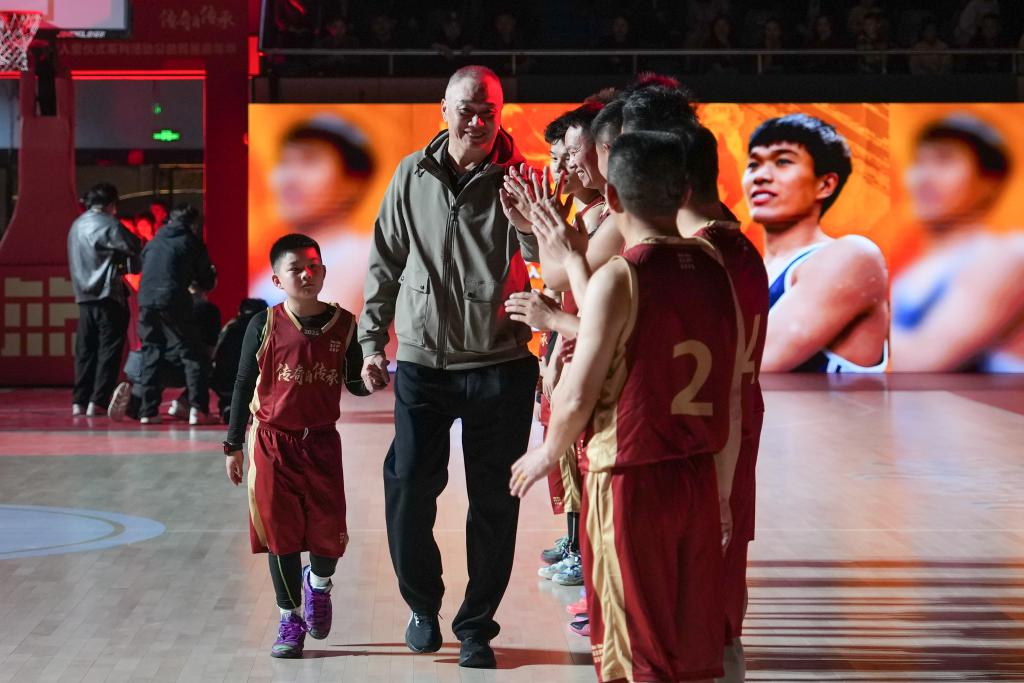 2026年4月11日,在2025年中国篮球名人堂入堂仪式系列活动“公益民星嘉年华”中,中国篮球名人堂成员王治郅(左二)在入场仪式上和球员们击掌。