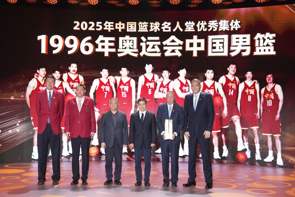 2026年4月12日,中国篮球名人堂“优秀集体”1996年奥运会中国男篮代表王治郅(左一)、孙军(左二)、宫鲁鸣(左三)、吴庆龙(右二)、巴特尔(右一)在入堂仪式上领取奖杯。
