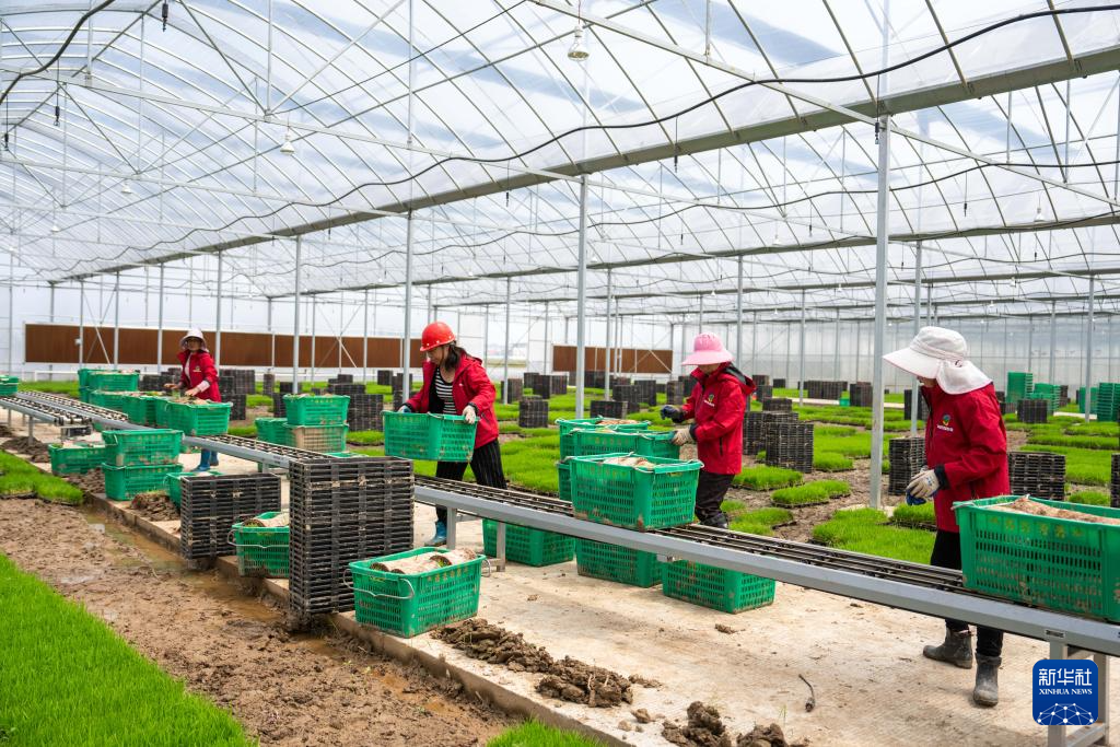 4月17日,在高塘岭街道湘江村智慧农场育秧大棚,工作人员把秧苗放在传输带上。新华社记者 陈思汗 摄